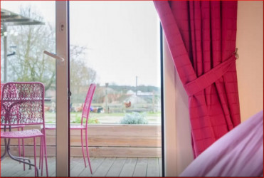 Chambre double équipée d’un lit 160 , d’une salle d’eau indépendante avec WC et douche, d’un réfrigérateur ( avec congélateur), d’une penderie, d’une terrasse indépendante avec tables, chaises et parasol. Un plateau de courtoisie est à disposition.